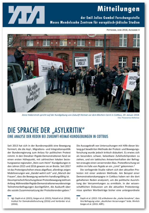 Emil Julius Gumbel Forschungsstelle und Moses Mendelssohn Zentrum für europäisch-jüdische Studien veröffentlichten im Juni 2018 diese Analyse. „Der Verein „Zukunft Heimat“ demonstriert seit einem Jahr in Cottbus gegen die Flüchtlingspolitik in der Stadt und in Deutschland. In einer aktuellen Studie der Emil Julius Gumbel Forschungsstelle des Moses Mendelssohn Zentrums werden die Redebeiträge bei diesen Kundgebungen…